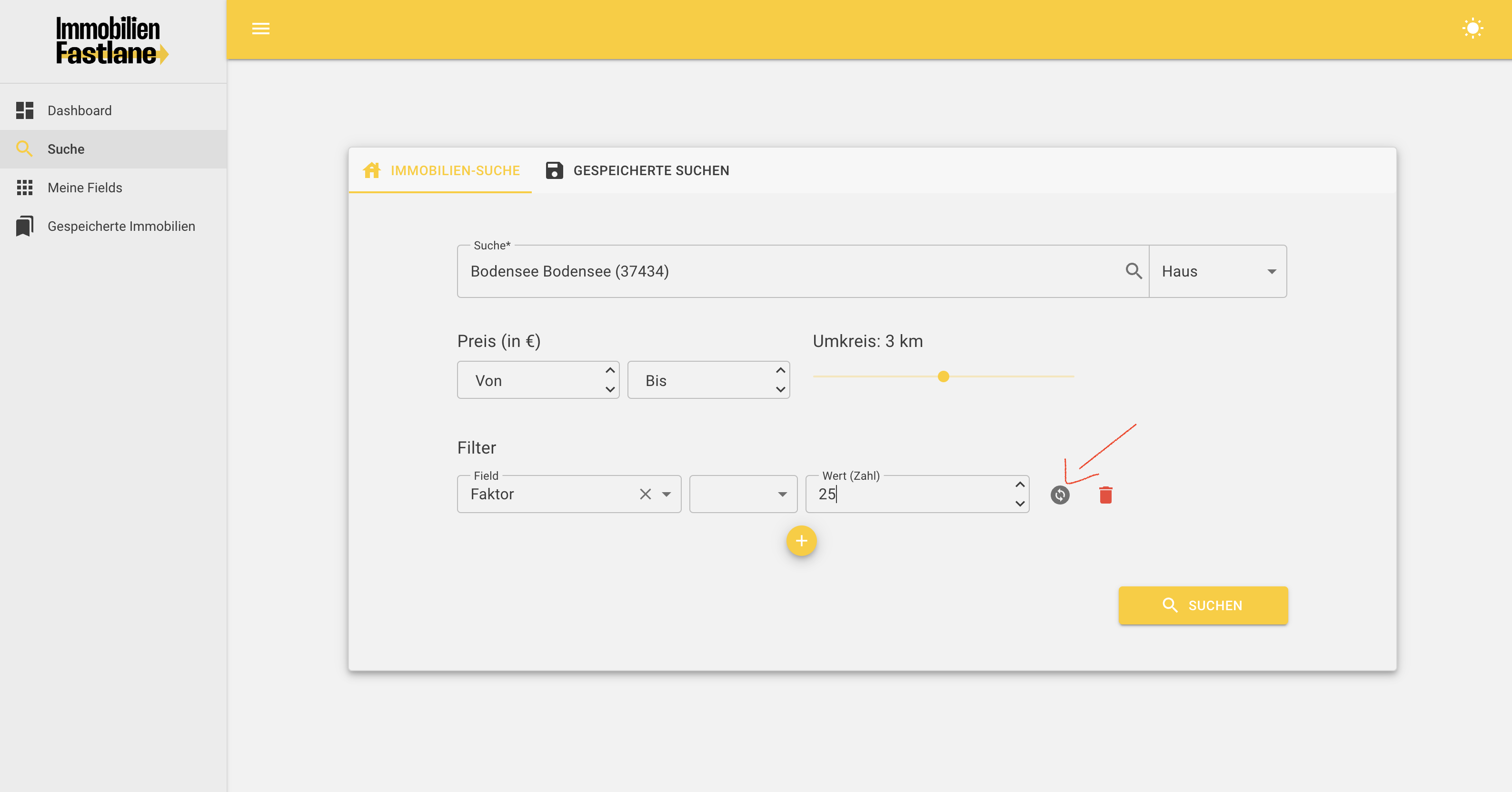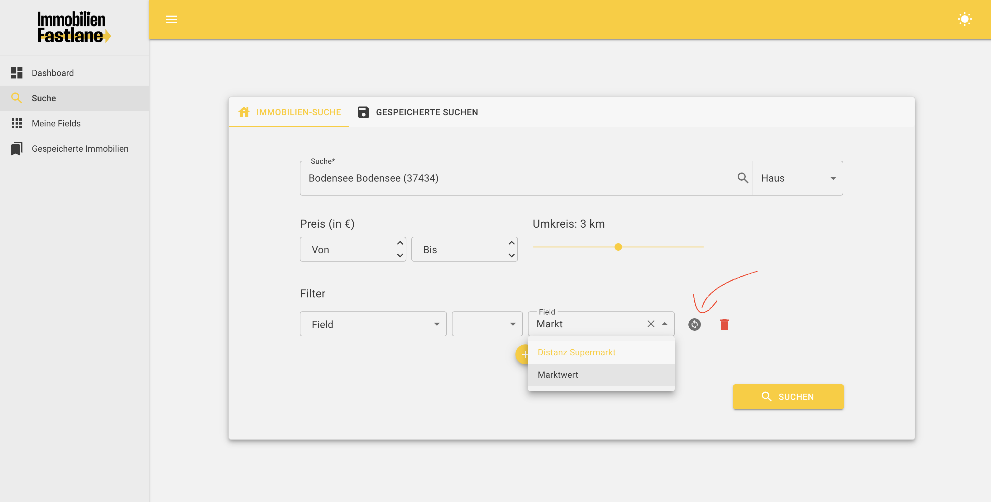 Soll der Faktor beispielsweise innerhalb eines bestimmten Wertes liegen, so wähle im rechten Auswahlfenster "Wert (Zahl)", um hier Deinen gewünschten Faktor einzugeben. Möchtest Du nur Exposés sehen, die unter dem Marktwert liegen, so klicke den grauen Button bis Dir das Eingabefeld "Fields" angezeigt werden.