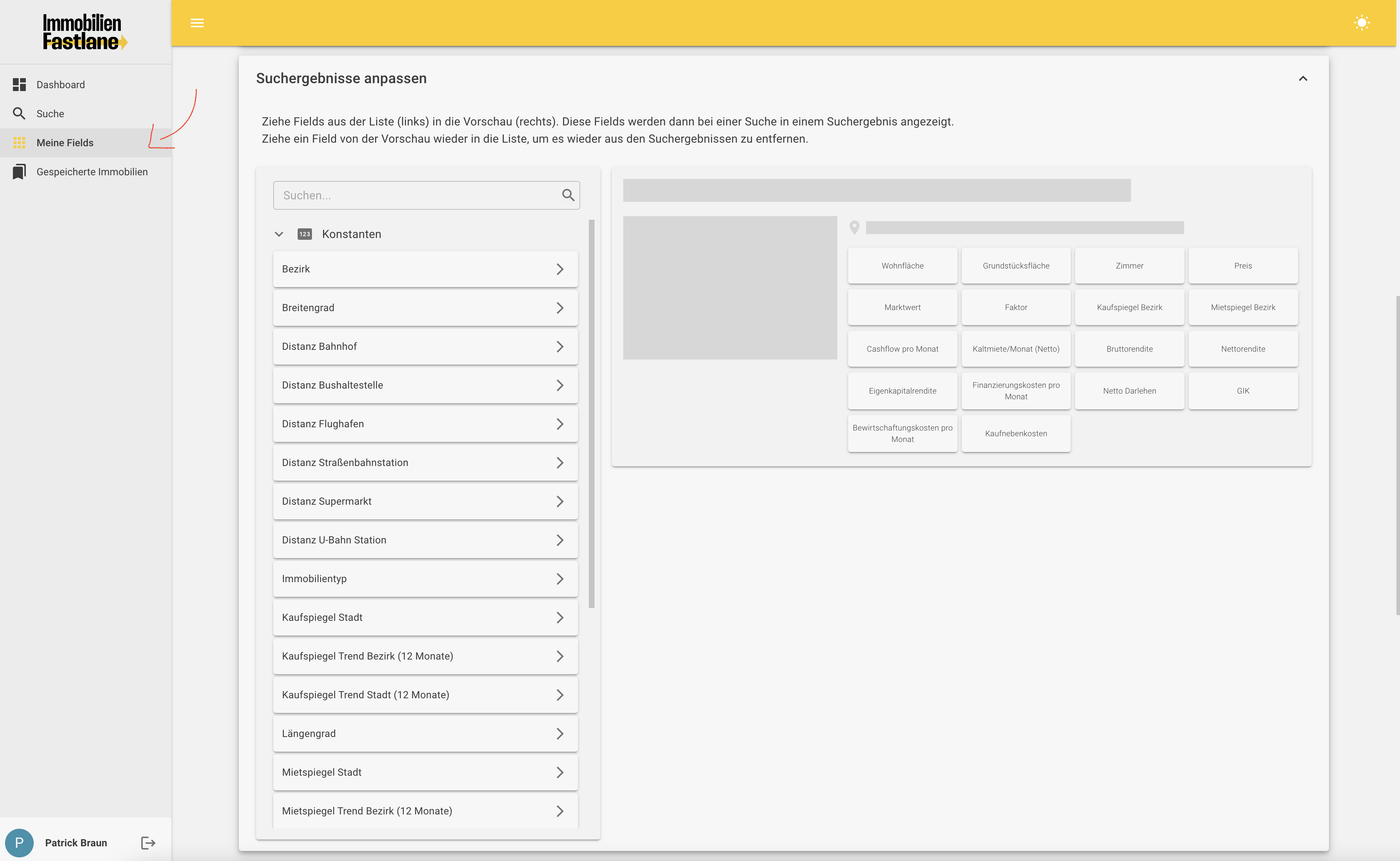Interessiert Dich eine dieser Werte auf den ersten Blick nicht —oder Du möchtest die Reihenfolge der angezeigten Werte verändern — so findest Du links in der Seitenleiste unter "Meine Felder" die Option "Suchergebnisse anpassen".